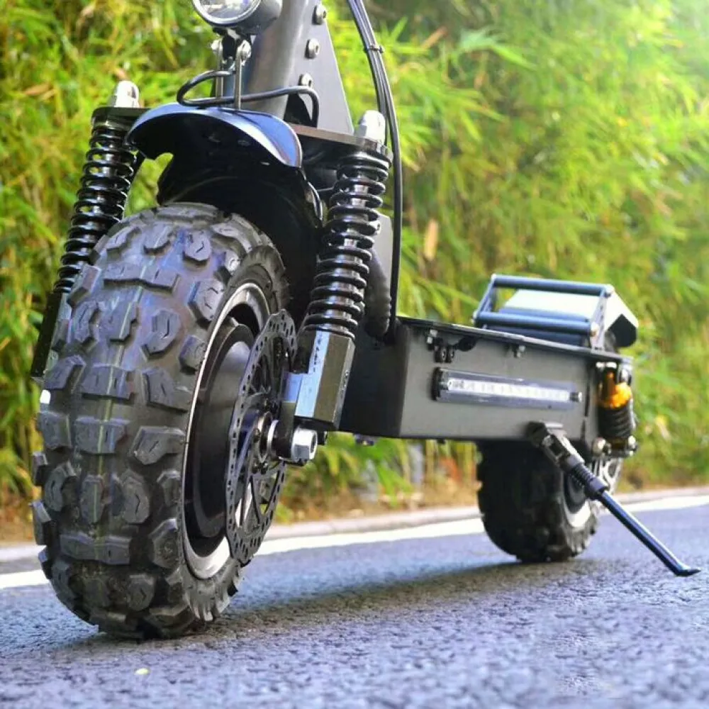 Электросамокат имеет два мотор-колеса, мощность каждого по 2700 Вт. Максимальная скорость 85 км/ч, ее можно сравнить со скоростью автомобиля. При желании спокойного передвижения и в целях экономии заряда, можно легко отключить один мотор. Рама выполнена из высокопрочного и легкого алюминия. Складывается, нет проблем с местом для хранения.
