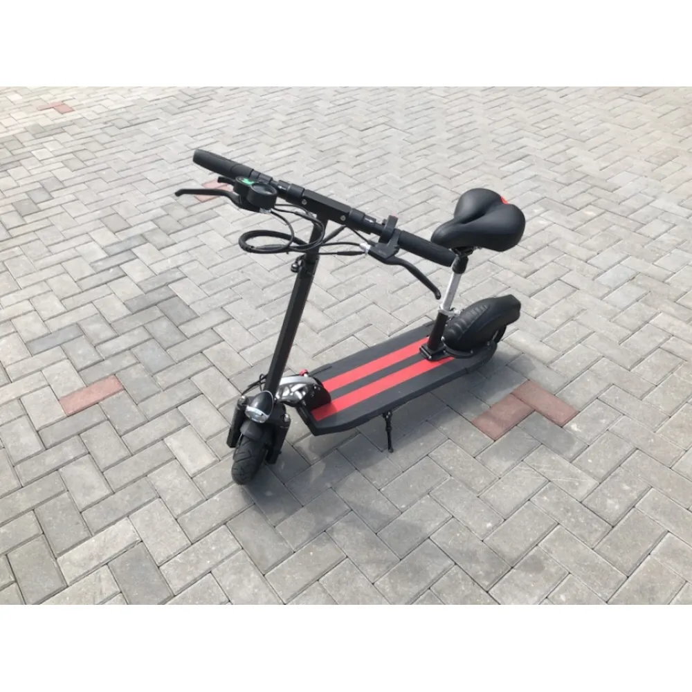 На электросамокате установлен литий-полимерный аккумулятор 9 А*ч емкости, полного заряда хватает на 35 км. Чтобы зарядить его необходимо включить в сеть 220 вольт на 4 часа. В комплекте идет регулируемое сидение. При длительном движении комфортно ехать сидя. Платформа широкая на ней помещается две ступни рядом. На руле с разных сторон два рычага, газ и тормоз. Есть информативный дисплей.
