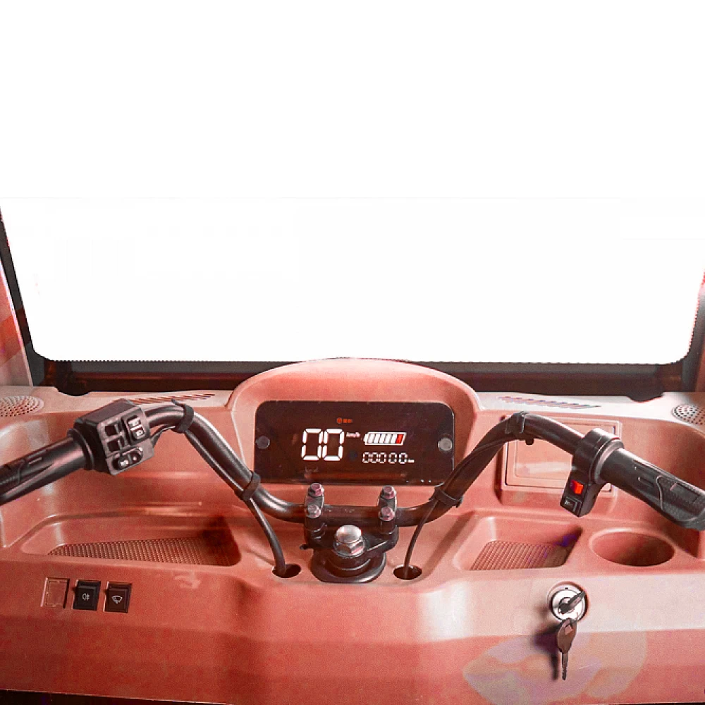 Грузовой электротрицикл Rutrike КАРГО Кабина Дуал красного цвета - это инновационное транспортное средство, которое сочетает в себе эффективность, экологичность и функциональность. Сконструированный для перевозки грузов, этот электротрицикл обладает высокой проходимостью и надежностью.